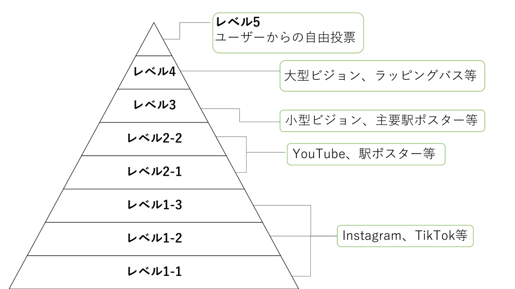 - レベル2: 中〜大規模の推し広告をオンラインまたは駅のポスター等掲載。
